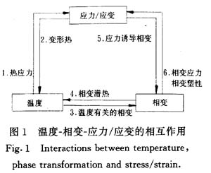 鋼在淬火過程中存在極為復(fù)雜的溫度、相變、應(yīng)力/應(yīng)變相互作用,在此方面已有許多報道[1]。如圖1所示,在淬火過程中,溫度造成熱應(yīng)力并影響材料的力學(xué)參數(shù)(彈性模量、泊松比、屈服強(qiáng)度和應(yīng)變硬化率等),從而影響材料的力學(xué)行為。應(yīng)力/應(yīng)變則以變形熱的形式反過來影響溫度的變化。隨著溫度的降低,在達(dá)到相變條件后將發(fā)生相變。溫度是決定相變的因素之一,但其本身又受著相變潛熱的影響。內(nèi)應(yīng)力的存在,可通過一種通常稱為應(yīng)力誘導(dǎo)相變的機(jī)制而影響相變的進(jìn)程。在相變過程中,各組成相的比容差異將造成相變應(yīng)力,同時由于材料的絕大多數(shù)參數(shù)除了依賴于溫度實(shí)際上也依賴于相態(tài),因此,相變也會對材料的力學(xué)行為產(chǎn)生影響。此外,在有內(nèi)應(yīng)力存在時相變過程中還會伴隨一種“反!钡乃苄孕袨椋床牧显趹(yīng)力低于屈服強(qiáng)度的情況下就可以發(fā)生不可逆變形的現(xiàn)象,稱為相變塑性。