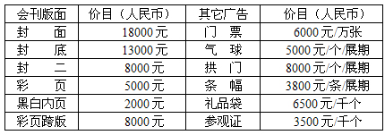 A區(qū):國內(nèi)企業(yè) RMB 7500/展位/展期 光地:國內(nèi)企業(yè) RMB 760/m²/展期 B區(qū):國內(nèi)企業(yè) RMB 6800/展位/展期 光地:國內(nèi)企業(yè) RMB 680/m²/展期 境外企業(yè) USD 1600/展位/展期 光地:境外企業(yè) USD 160/m²/展期 2、標準展位費用:包括展出場地、三面展板,楣板1塊,洽談桌1張,椅子2把,射燈2盞,220V插座一只;雙開口展位加收10%的展位費用。(光地:36㎡起租,展商需自行設計及布置展位)