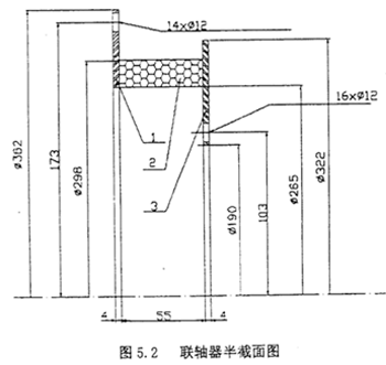 根據(jù)實際情況觀察可知橡膠塊左右分別有兩塊鋼板,析上均有一些圓孔,通過實際測量得到聯(lián)軸器的基本尺寸和形狀。由于聯(lián)軸器為軸對稱圖形,故只畫出其截面圖(圖5.2)。