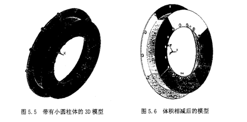 進行體相減,生成系列小孔。主要用到Subtract命令,先選擇兩個大面,然后選上所有的小圓柱體。最后有Replot命令生成新圖形。結(jié)果如圖5.6所示。