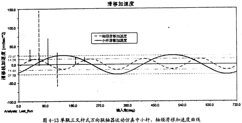 由圖4-13可以知道,在一定的夾角下,小桿在滑道中有滑移加速度同小桿球面中心相對(duì)軸頸的滑移加速度是不同的,前者要大于后者,且它們變動(dòng)的頻率也不一樣,在一個(gè)回轉(zhuǎn)周期中,前頻率是1次,而后者2次。此圖中的兩曲線同第三章中的理論分析曲線圖3-13、圖3-14是吻合的,只是小桿滑移的加速度曲線在外形上有差異,仿真的曲線相當(dāng)?shù)钠交、?guī)則,但理論分析曲線卻不規(guī)則,這可能是在計(jì)算中簡(jiǎn)化和省略的原因。盡管如下,這在一定的程度上也證明了三叉桿式萬(wàn)向聯(lián)軸器理論分析中對(duì)小桿滑移加速度和軸頸滑移加速度這兩項(xiàng)計(jì)算的正確性。(值得說(shuō)明的是此圖中曲線有時(shí)有突變的現(xiàn)象,主要是考慮到計(jì)算機(jī)的性能,計(jì)算中步長(zhǎng)稍大的原故。在后面的分析曲線中也出現(xiàn)了這樣的情況,將不再作說(shuō)明。)