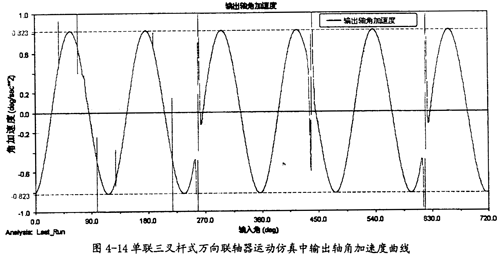 由圖4-9可以知道,當(dāng)輸入軸轉(zhuǎn)速恒定為90o/s時(shí),輸出軸并不作恒速轉(zhuǎn)動(dòng),而是以90o/s為中心,作非常有規(guī)律的周期性運(yùn)動(dòng),在每一個(gè)回轉(zhuǎn)周期中,它的變化頻率為3次。這里的結(jié)果同第三章中的曲線圖3-8也是完全吻合的,因此在一定的程度上也證明了三叉桿萬(wàn)向聯(lián)軸器轉(zhuǎn)速分析理論的正確性。