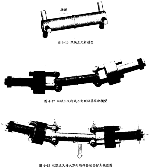 在本次分析中,建立的裝配模型是在第三章中圖3-2所示的模型的基礎(chǔ)上除去關(guān)節(jié)軸承,將三叉桿用圖4-16所示的雙聯(lián)三叉桿替換,在此模型的右端再加上同左端相同的結(jié)構(gòu),就得到雙聯(lián)三叉桿式萬(wàn)向聯(lián)軸器的裝配模型。此模型如圖4-17所示。