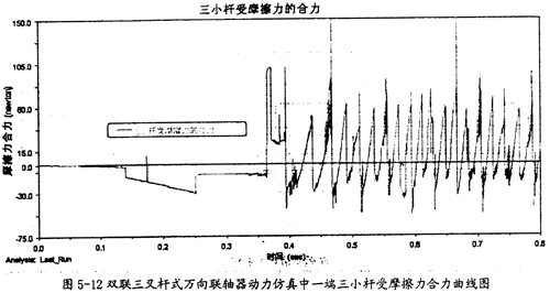 由圖5-10可以看出,雙聯(lián)三叉桿式萬(wàn)向聯(lián)軸器在動(dòng)力仿真的過(guò)程中,其一端的三小桿同滑桿套軸間的摩擦力變化相當(dāng)有規(guī)律。當(dāng)小桿相對(duì)滑桿套軸運(yùn)動(dòng)反向時(shí),它們就會(huì)在正負(fù)間有規(guī)律的切換。
