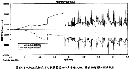 由圖5-12可以看出,雙聯(lián)三叉桿式萬(wàn)向聯(lián)軸器在動(dòng)力仿真的過(guò)程中,其一端的三個(gè)小桿所受的摩擦力的合力變動(dòng)較有規(guī)律,其值在開(kāi)始一段平滑,其后幾乎以0為中心波動(dòng)。由于這三個(gè)摩擦力的方向均平行于輸入軸或輸出軸軸線,故此合力會(huì)在輸入軸和軸出軸上產(chǎn)生軸向的力,在輸入軸和輸出軸上產(chǎn)生摩擦扭矩。如取其水平較高值60牛來(lái)計(jì)算,它產(chǎn)生的摩擦扭矩為270N·mm(60×0.3×15=270,其中0.3為動(dòng)摩擦系數(shù),15為摩擦半徑),此值相對(duì)圖5-13中的值而言相當(dāng)小。