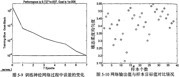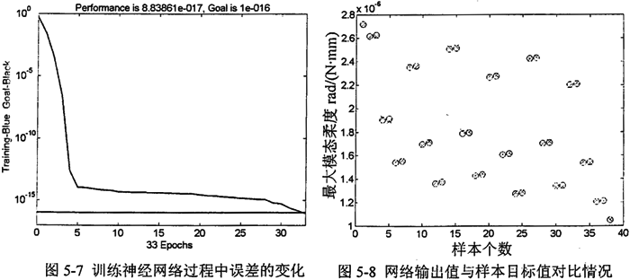 進(jìn)行動(dòng)態(tài)優(yōu)化時(shí),若要建立起目標(biāo)函數(shù),首先要獲得一組能夠精確計(jì)算f4(x)的權(quán)值,這就需要通過(guò)樣本訓(xùn)練BP神經(jīng)網(wǎng)絡(luò),當(dāng)誤差精度達(dá)到要求時(shí),訓(xùn)練停止,并得到了該組權(quán)值,利用該組權(quán)值與設(shè)計(jì)變量通過(guò)三層BP網(wǎng)絡(luò)可以計(jì)算出訓(xùn)練后的分目標(biāo)函數(shù)值f4(x)。在訓(xùn)練神經(jīng)網(wǎng)絡(luò)時(shí),學(xué)習(xí)速率取為0.01,動(dòng)量常數(shù)取為0.9,目標(biāo)誤差取為l×10-16。當(dāng)訓(xùn)練結(jié)束時(shí),網(wǎng)絡(luò)輸出值與樣本目標(biāo)值之間的誤差均方根值為8.8386×l0-17(見(jiàn)圖5-7),訓(xùn)練過(guò)程誤差的變化情況及訓(xùn)練完成后網(wǎng)絡(luò)輸出值與樣本目標(biāo)值對(duì)比情況如圖5-8所示。
