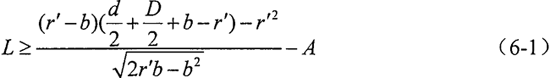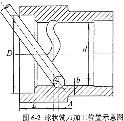 由于球狀銑刀的刀刃部分為半球頭形狀,為避免球頭銑刀的刀柄與殼體內(nèi)壁發(fā)生干涉,導致內(nèi)空間正弦滾道被銑削出平面,則空間正弦曲線的平衡位置到殼體端面的距離L應滿足一定的條件,由圖6-2中各參數(shù)的關(guān)系,可以得到