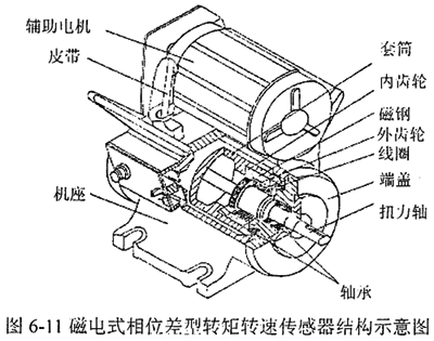 圖6-11為磁電式相位差型轉(zhuǎn)矩轉(zhuǎn)速傳感器的結(jié)構(gòu)示意圖,它由機座、端蓋、扭力軸、內(nèi)齒輪、外齒輪、磁鋼、線圈軸承等組成。內(nèi)齒輪、磁鋼固定在套筒上,線圈固定在端蓋上,外齒輪固定在扭力軸上,當內(nèi)外齒輪發(fā)生相對轉(zhuǎn)動時,由于磁通不斷變化,在線圈中便感應出近似正弦波的感應電勢ul、u2,兩感應電勢的初始相位差是恒定的,考慮到正反加載,φ0設(shè)計在大約180°位置上,當加上扭力時,扭力軸發(fā)生扭轉(zhuǎn)變形,在彈性范圍內(nèi)外加扭矩與機械扭轉(zhuǎn)角成正比,這時ul、u2訊號的相位差要發(fā)生變化,即