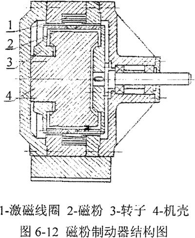 采用磁粉制動器作為試驗的加載裝置。磁粉制動器由轉(zhuǎn)子、機殼、激磁線圈、磁粉組成,其結(jié)構(gòu)如圖6-12所示。在激磁線圈不通電流時,不產(chǎn)生磁通,磁粉呈自由狀態(tài)。當軸轉(zhuǎn)動時,由于離心力的作用,使磁粉散布在轉(zhuǎn)動件與機殼之間,若此時激磁線圈通電流,則在線圈周圍產(chǎn)生磁場,轉(zhuǎn)動件與機殼間的磁粉沿磁通方向連接成鏈狀,由于磁粉間的結(jié)合力,使工作面之間產(chǎn)生摩擦力,從而形成制動力矩,起到加載的作用。該力矩與激磁電流的大小基本成正比,故通過調(diào)節(jié)激磁線圈的電流大小可在一定范圍內(nèi)改變制動力矩的大小。