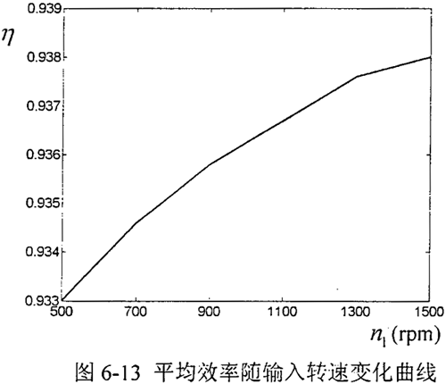 進行減速器效率試驗前,首先讓減速器在輸入轉(zhuǎn)速為500rpm的條件下,空載跑合4個小時,觀察運轉(zhuǎn)正常后,進入試驗的準備階段。為測得準確試驗數(shù)據(jù)必項對轉(zhuǎn)矩轉(zhuǎn)速測量儀進行常數(shù)輸入和轉(zhuǎn)矩調(diào)零設(shè)置,一切準備完畢后,開始對減速器進行試驗測試。當輸入軸轉(zhuǎn)速取不同值時計算出減速器樣機的傳動比及樣機總評傳動比如表6-1所示,通過分析測試數(shù)據(jù)可知,經(jīng)實測最大的傳動比誤差為-0.0148,平均傳動比誤差為-0.0078。表明樣機的傳動比準確,傳動精度高。經(jīng)分析可知,正弦滾道的加工精度是造成整機傳動誤差的主要原因。