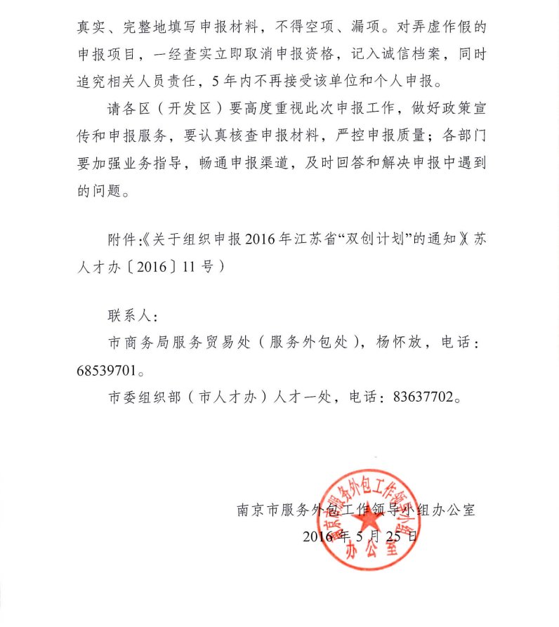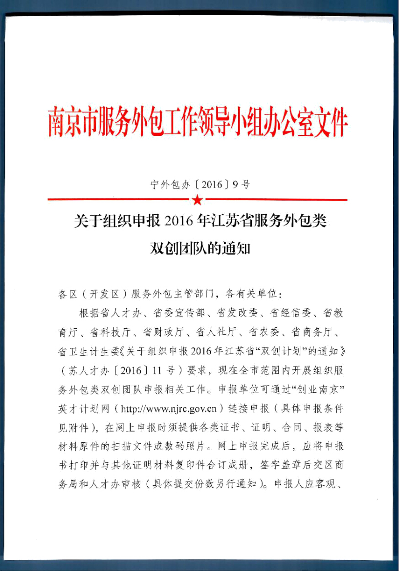 關(guān)于組織申報(bào)2016年江蘇省服務(wù)外包類雙創(chuàng)團(tuán)隊(duì)的通知